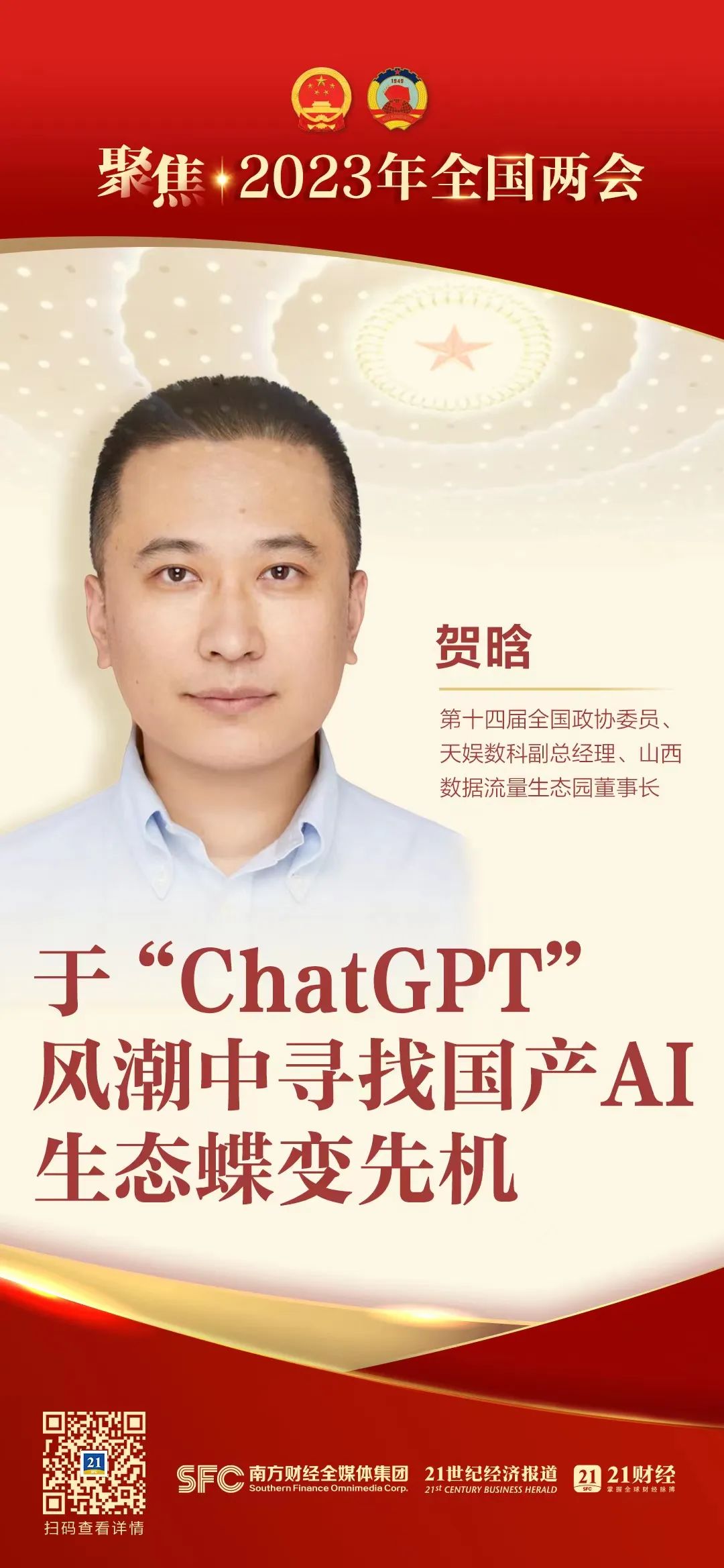 21世紀(jì)經(jīng)濟(jì)報(bào)道 兩會(huì)專題專訪報(bào)道2月13日,21世紀(jì)經(jīng)濟(jì)報(bào)道“聚焦 | 2023年兩會(huì)”專欄對第十四屆全國政協(xié)委員、天娛數(shù)科副總經(jīng)理賀晗進(jìn)行專訪。作為數(shù)字經(jīng)濟(jì)領(lǐng)域的委員,生于198