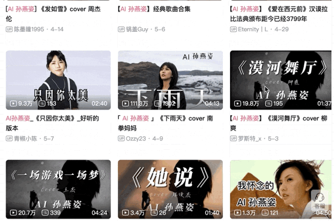近日,AI“孫燕姿”爆火,其翻唱的《發(fā)如雪》《下雨天》短短幾天就突破百萬播放量,一度登上各大平臺(tái)熱搜榜首位,成為“新晉頂流”。在B站在搜索框輸入“AI”后,第一個(gè)詞條就是“AI