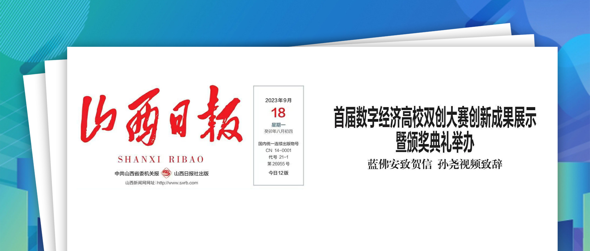 9月18日,《山西日報(bào)》頭版發(fā)表文章《首屆數(shù)字經(jīng)濟(jì)高校雙創(chuàng)大賽創(chuàng)新成果展示暨頒獎(jiǎng)典禮舉辦》,報(bào)道了全國首個(gè)圍繞數(shù)字經(jīng)濟(jì)領(lǐng)域,面向高校學(xué)子的雙創(chuàng)大賽,人民網(wǎng)、光明網(wǎng)等多個(gè)權(quán)