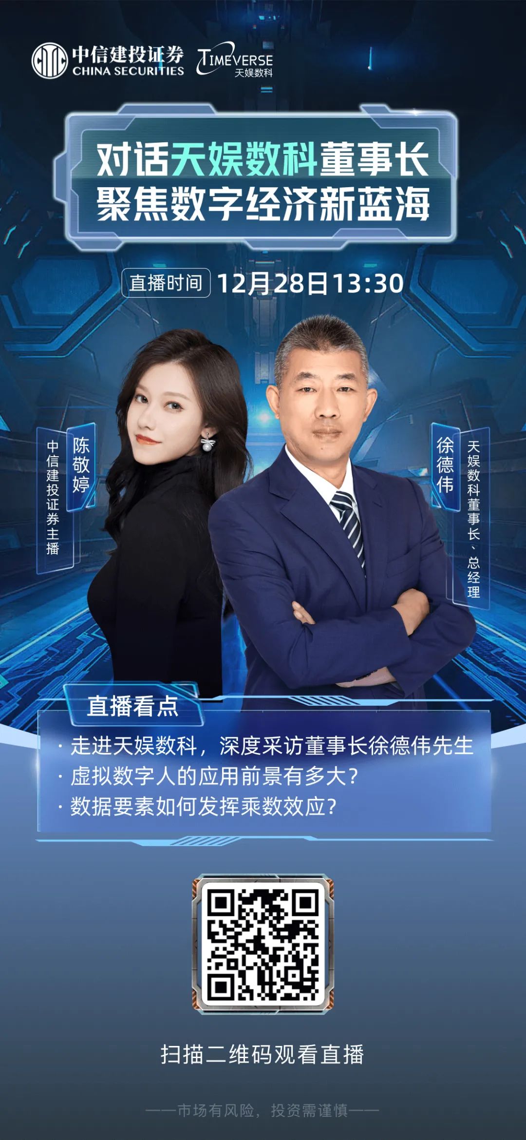 11月22日,中信建投證券北京東城分公司一行來到天娛數(shù)科數(shù)字人基地走訪調(diào)研,天娛數(shù)科董事會(huì)秘書劉笛、天娛數(shù)科子公司元境科技CEO王智武、天娛數(shù)科子公司元圓科技總經(jīng)理鄭屹呈